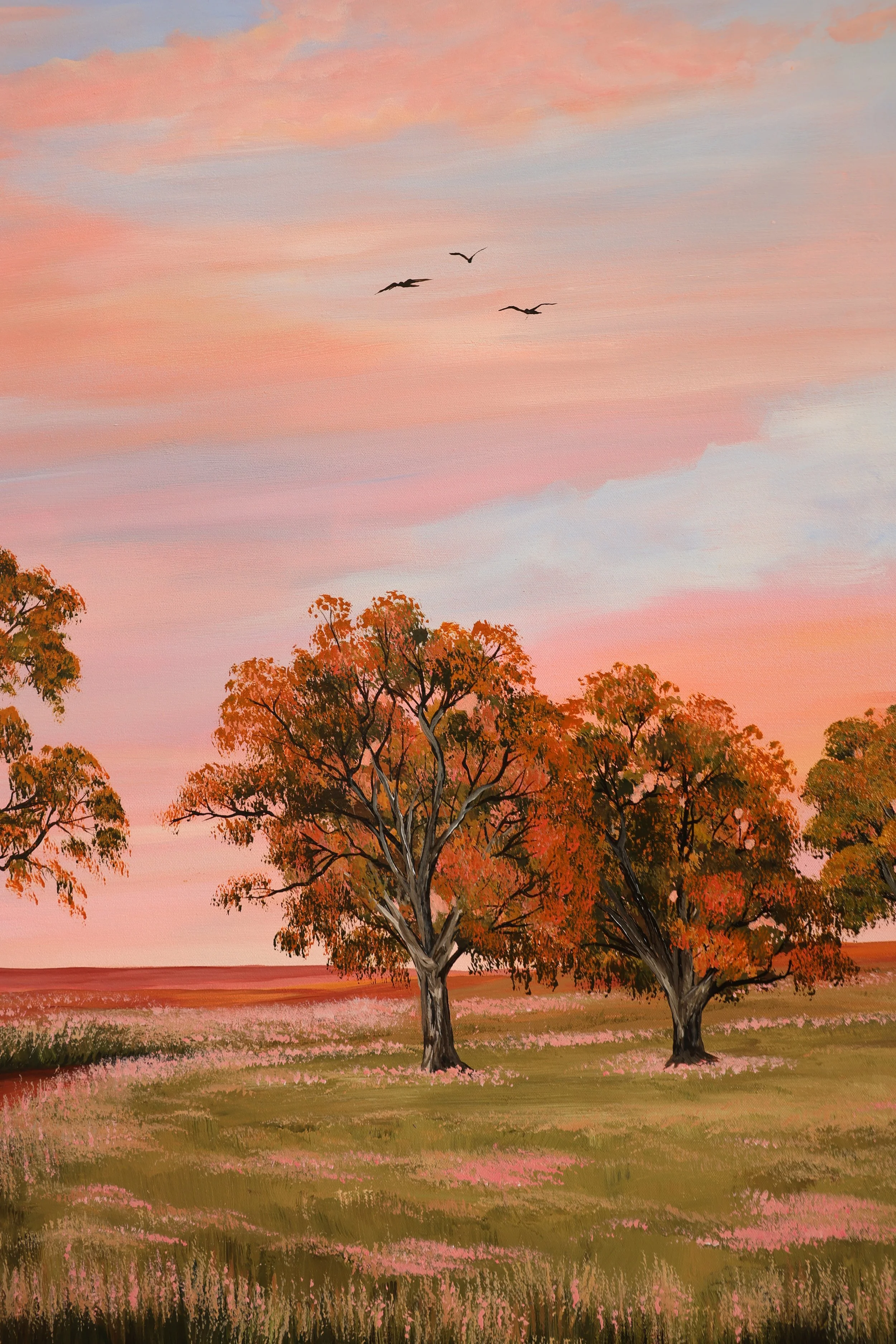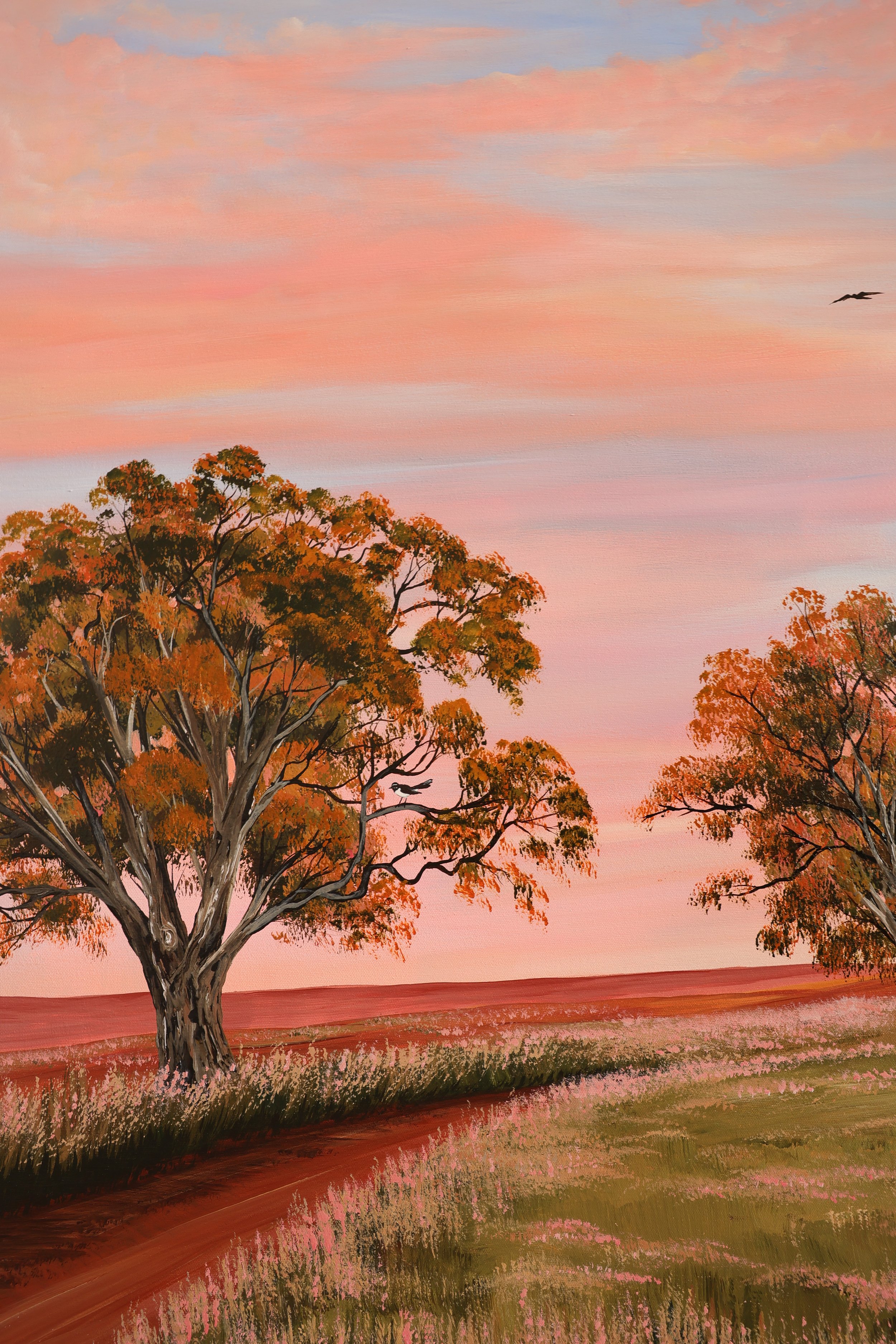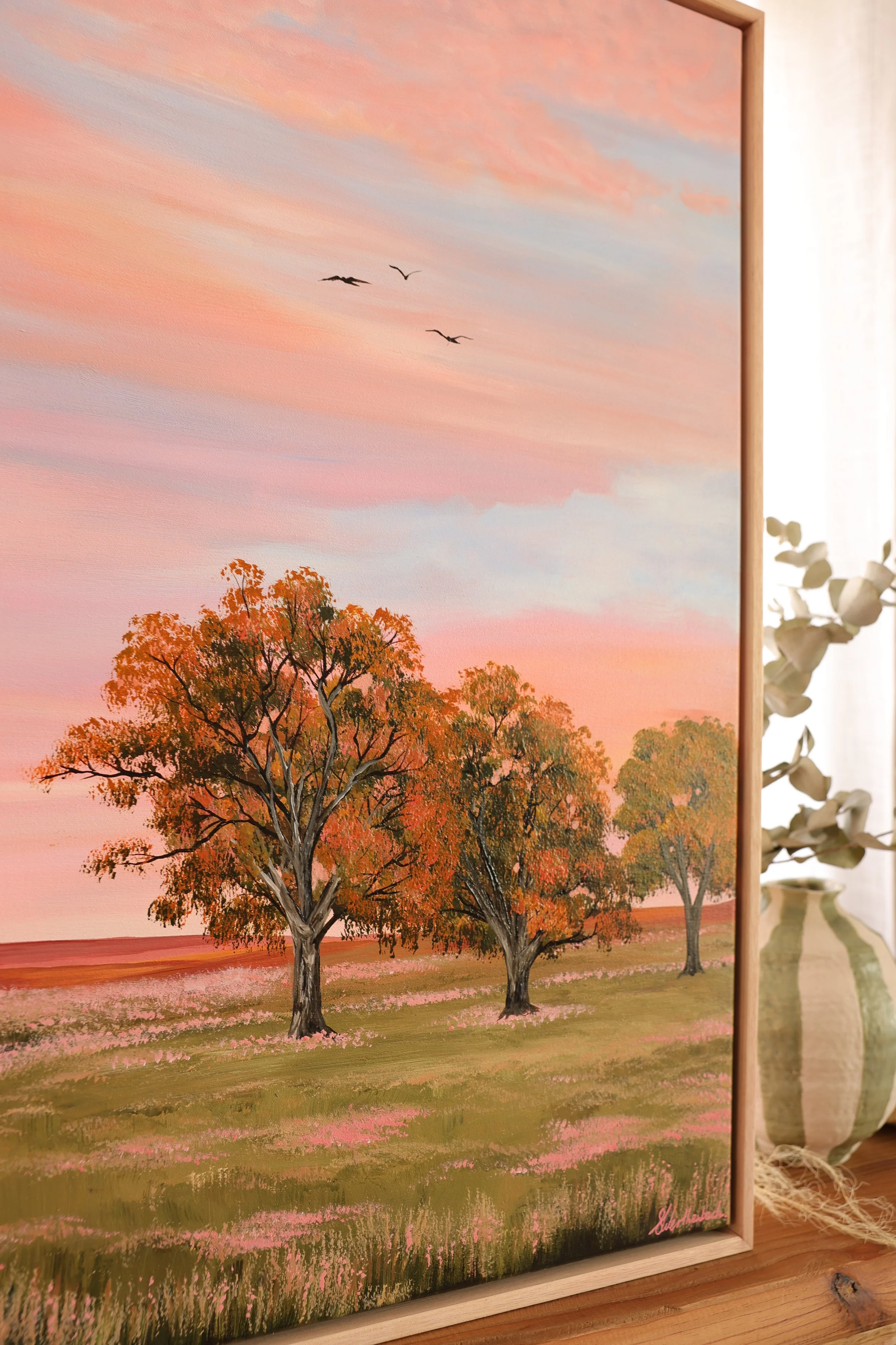 Inspired by a picture taken of a dam in the Ballandean Stanthorpe region of Queensland. Pretty pops of watermelon pink and baby blue give this piece a really beautiful peaceful but vibrant feel. Complete with a cute little blue Splendid Fairy Wren purchased on the rustic wooden fence post.