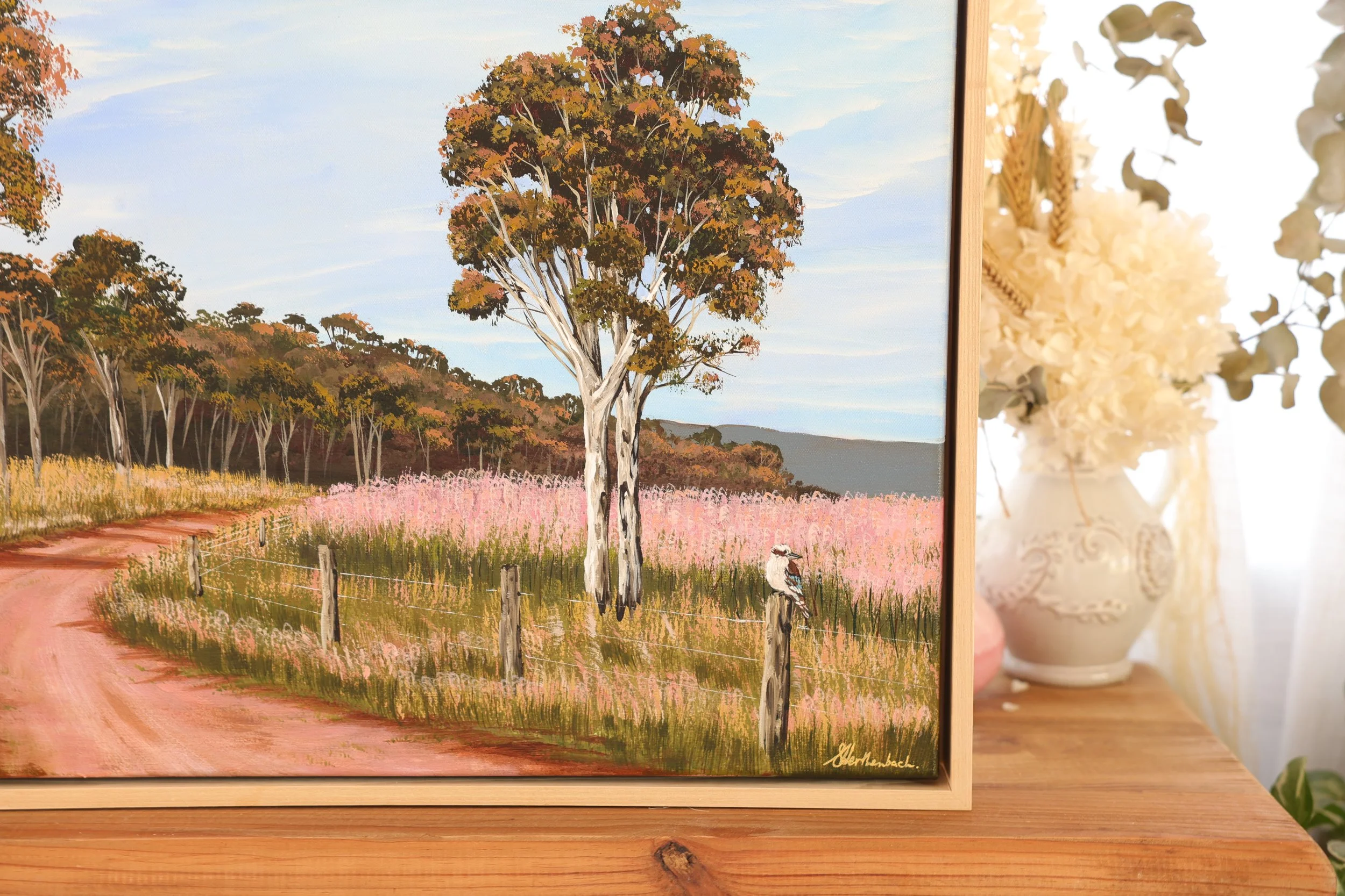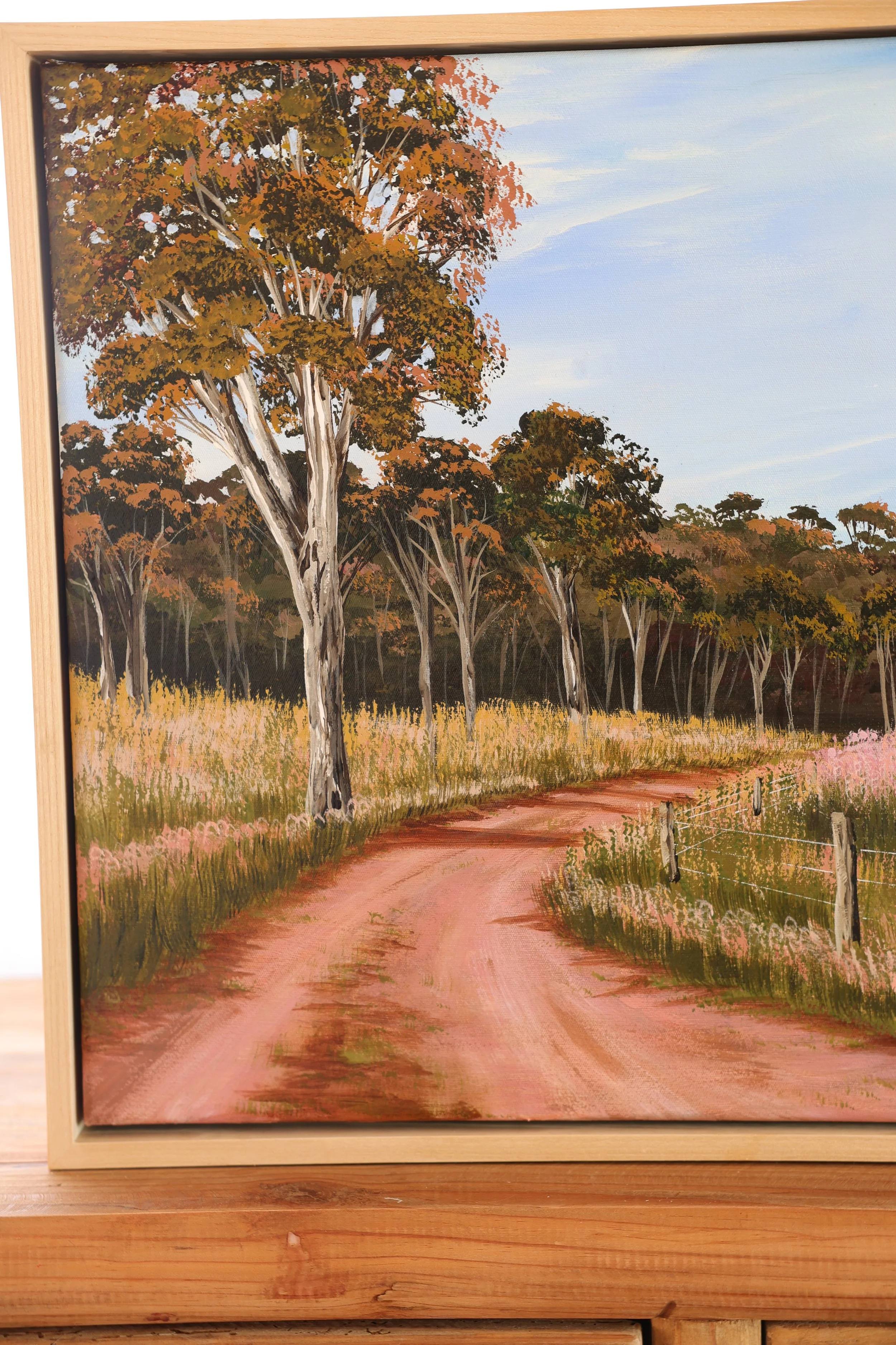 63 × 63cm | Acrylic on canvas. Shadow box framed in Flooded Gum. Ready to hang - hardware installed on the back.